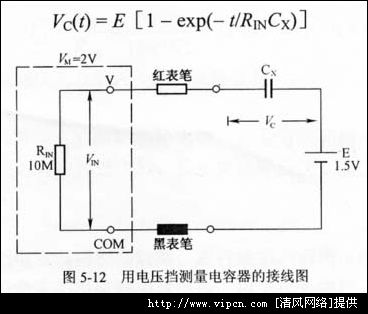 测量电路如图5-12所示,E为外接的1.5V干电池。将数字万用表拨到直流2V档,红表笔接被测电容Cx的一个电极,黑表笔接电池负极。 2V档的输进电阻RIN=10MΩ。接通电源后,电池E经历RIN向Cx充电,开端树立电压Vc。Vc与充电时间t的联系式为