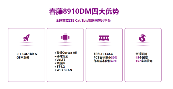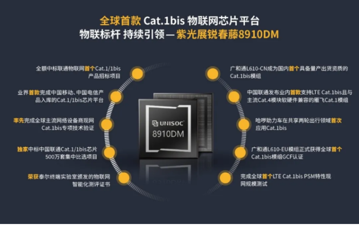 紫光展锐春藤8910DM作为全球首款LTE Cat.1bis物联网芯片平台,自发布以来已凭借先进的技术规格与领先的技术成熟度迅速成为中速物联芯片的标杆。
