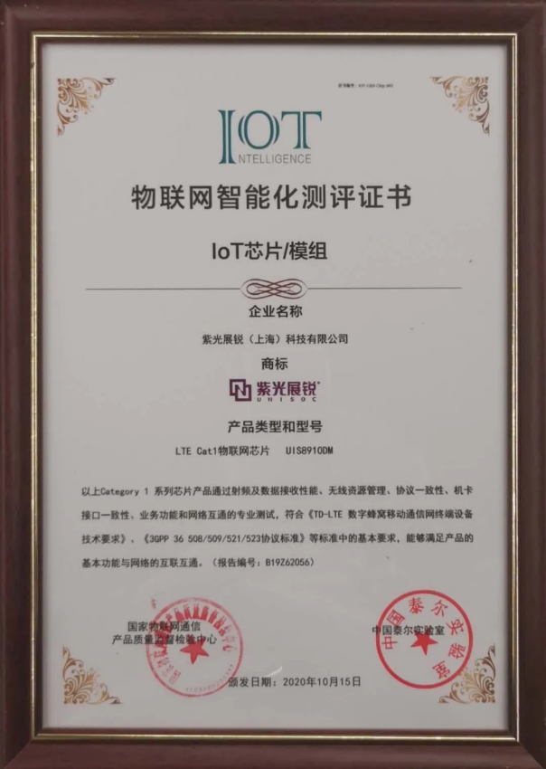 中国信息通信研究院泰尔终端实验室在中国国家会议中心召开“泰尔论坛2020-5G+AIoT助推人居生活数字化发展”专题活动中,紫光展锐LTE Cat.1bis物联网芯片春藤8910DM荣获泰尔终端实验室颁发的物联网智能化测评证书。