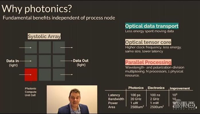 ▲Lightmatter 联合创始人兼 CEO 尼克 · 哈里斯在 2020 年 Hot Chips 上讲解光子计算相较电子计算的延时、带宽、功耗优势