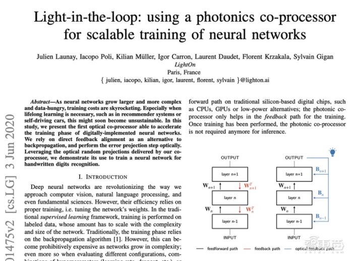 2018 年,成立两年、总部位于法国巴黎的创企 LightOn 宣布,它已经开始在欧洲的数据中心测试自己的光学处理单元(OPU)技术。2020 年 6 月,LightOn 发表的新论文显示,其光学神经网络训练芯片在运行基于 MNIST 手写数字数据集训练的模型时,学习率为 0.01,测试准确率达到 95.8%;同一算法在 GPU 上的学习率为 0.001、准确率达 97.6%。而该光学芯片的功耗效率要比 GPU 高出一个数量级。