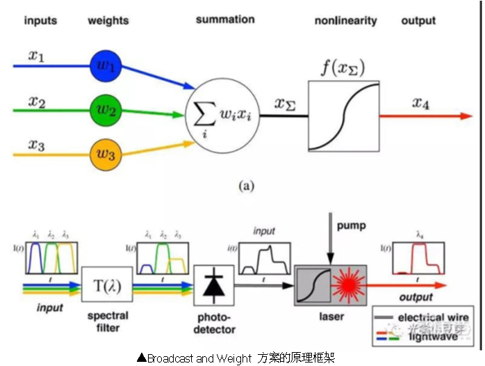 Nahmias 在普林斯顿 PhD 期间的主要研究方向即是光子 AI 芯片。与 MIT团队不同,他们采用的并非 MZI,而是被称为 Broadcast and Weight 的方案,相较 MZI 型方案多了光电转换过程,且对相位不敏感。Nahmias 称其光子集成电路可以取代 3000 块 TPU 板,更加节省能耗,且能突破现有 AI 芯片传输数据的瓶颈。