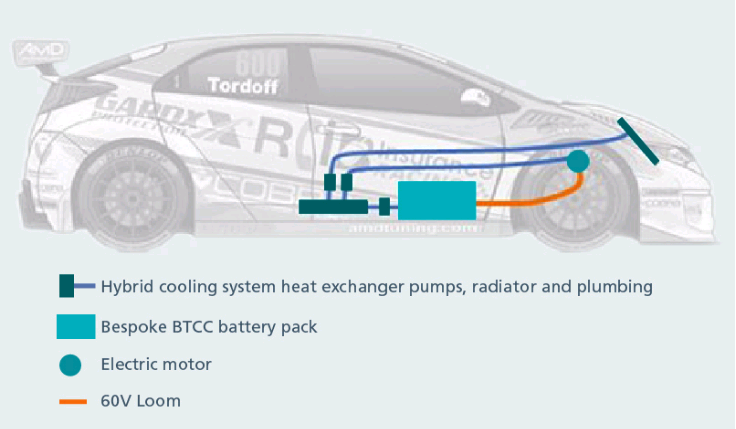 BTCC 规定,车手可以战术性地使用电机提升车辆性能,并提高车辆加速能力。为此,Delta Motorsport 设计了新的电池组和相关电子产品。全新的 48V 锂离子电池组采用创新型智能电源管理及高功率密度 DC-DC 转换器和稳压系统。电池组为逆变器 - 电机组合供电,并使用其产生的再生电力,同时高功率密度转换器可为汽车的所有电路和设备供电。这种架构实现的功率密度和电源管理水平无需使用交流发电机系统,从而进一步减轻重量,提高性能与可靠性。