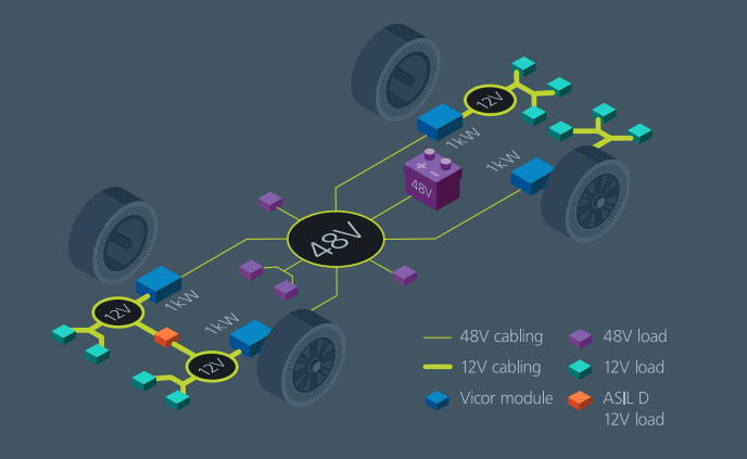 与 12V 系统相比,对于给定功率级而言,48V 系统电流低四倍、功耗低 16 倍。在 1/4 电流下,电缆和连接器更小、更轻,成本也更低。此外,分布式电源架构还有显著的热管理及电源系统冗余优势。