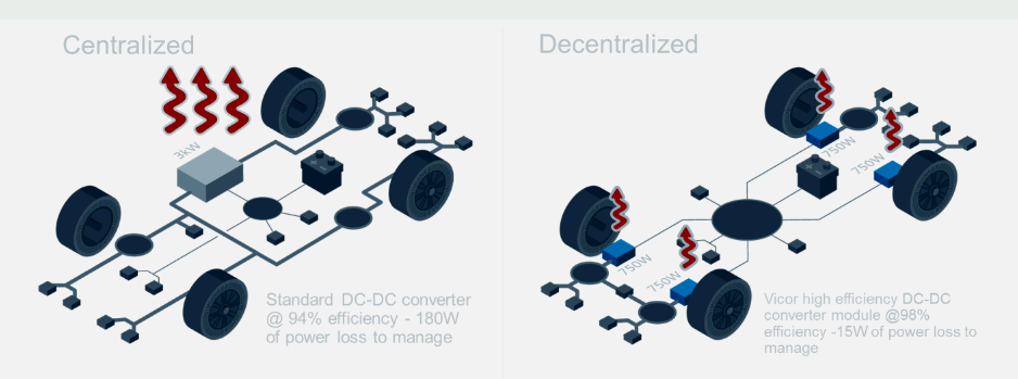 Vicor 全球汽车业务开发副总裁 Patrick Wadden 认为:“使用高密度积木式设计的 48V 分布式电源架构才是更具优势的做法。而且,不管是混动还是纯电动车都可以使用这样的方法。”