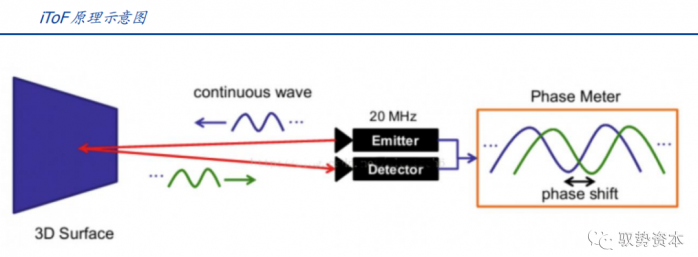 ToF(Time of Flight),通过测量发射光与反射光的飞行时间计算出光源与物体之间的距离,本质上是时间维度测量。根据测距的方式不同,目前存在两种ToF技术路线:iToF(间接飞行时间,indirect-ToF)和dToF(直接飞行时间,direct-ToF)。dToF直接测量飞行时间,原理是通过直接向测量物体发射光脉冲,并测量反射光脉冲和发射光脉冲之间的时间间隔,得到光的飞行时间,从而直接计算待测物体的深度。iToF则是通过发射特定频率的调制光,检测反射调制光和发射的调制光之间的相位差,测量飞行时间。