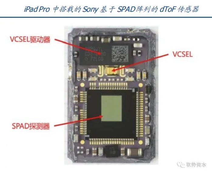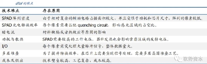 dToF深度算法相对简单,难点在于用以实现较高精度的SPAD。dToF要检测光脉冲信号(纳秒甚至皮秒级),因而对光的敏感度要求会很高,因此接收端通常选择SPAD(单光子雪崩二极管)或者APD(雪崩光电二极管)这类传感器来实现,集成度弱于普通的CMOS图像传感器,像素尺寸一般大于10μm,从而分辨率通常较差,成本更高。SPAD是dTOF技术的核心,技术难度大且制作工艺复杂,目前世界上极少厂家具备量产能力,集成难度很高难以小型化应用在手机等小型消费电子上,因而除传统热门应用领域车载LiDAR之外,消费电子领域目前仅有苹果一家实现商用(iPad Pro首次搭载)。