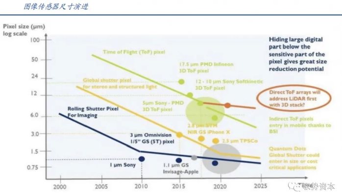 未来TOF会向更高集成度、更小的传感器尺寸、更高分辨率发展。目前传统的CIS单像素尺寸最小可达到0.7μm,而目前0.6μm也已经在研发中。但ToF传感器更要求单像素获取信号的能力,因而需要更大的单像素尺寸;dToF传感器电路设计比较复杂,需占据较大的片上尺寸;iTOF像素尺寸则需暂时让步于更高的集光效率。种种原因使得ToF图像传感器的小型化存在一定困难。