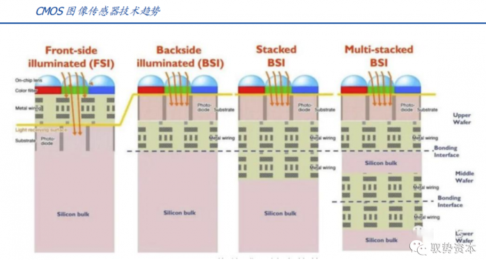 半导体工艺改进将有望实现TOF传感器小型化。ToF传感器厂商通过半导体工艺方案的改进,如背照式(BSI)、堆栈式(Stacked)CMOS等技术,将原本位于光电二极管上方的布线层移至下方,以及将光电转换器、电子倍增器(electron multipier)这些部分垂直堆叠,增大像素开口率,同时减小像素尺寸。目前根据松下最新的研究成果,dToF传感器也可以用CMOS工艺实现,集成度已经在数量级上逼近iToF方案。