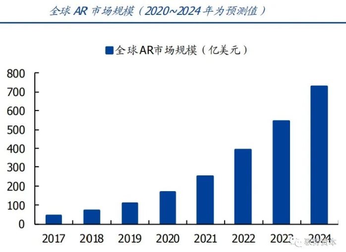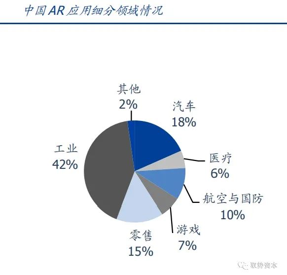 根据Markets and Markets,2019年全球AR市场规模达到107亿美元,预计到2024年将达到727亿美元,复合增长率达46.6%。过去几年中,以Facebook、英特尔、高通和三星为代表的公司在AR领域进行了大量投资,推动了全球AR市场的快速增长。中国AR市场规模预计在2024年将达到约59亿美元,从下游应用来看,工业应用占比最大,约占42%,其次是汽车(18%),零售(15%)以及航空与国防(10%)等。