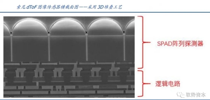 Sony的dTOF方案首次采用3D堆叠工艺,像素内连接通过混合键合互连技术将探测器晶圆和逻辑电路晶圆键合实现,同时,深沟槽隔离(Deep trench isolation)也被应用,充满金属的沟槽完全隔离了像素。从而有效控制了dTOF传感器的尺寸,使其成功的应用在iPad这类小型消费电子设备中。
