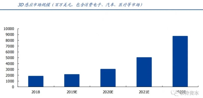 从出货量上来看,我们预测智能手机3D感测需求将从2017年的4000万部增加至2019年的2亿部以上,其中2019年的ToF机型还主要集中在几款高端旗舰机,从2020年开始TOF的出货量将进一步爆发,在整体3D感应中占比有望达到40%。