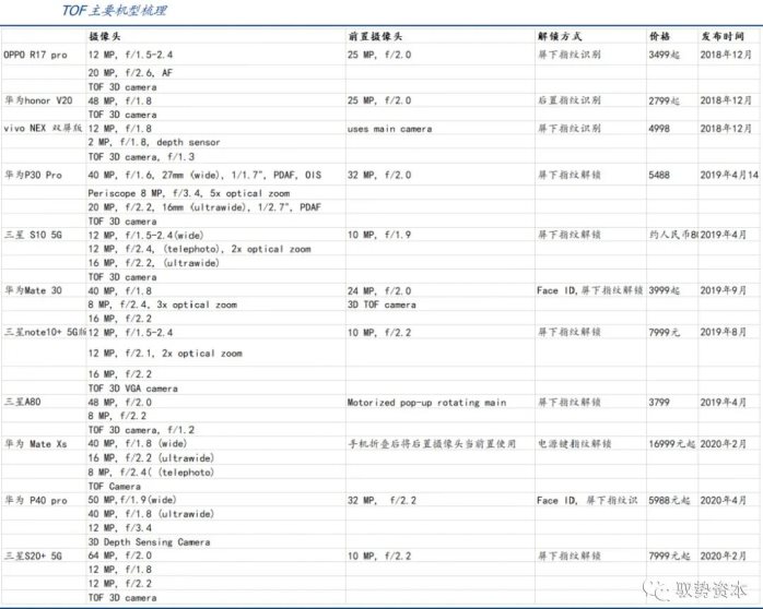 我们预计ToF和结构光的BOM成本大约为12~15美元和20美元,相比之下TOF更具有成本优势。以iPhone X为例,结构光技术的解决方案包括三个子模块(点投影仪,近红外摄像机和泛光照明器+接近传感器),而ToF解决方案则将三个集成到一个模块中,可以将包装成本降低。