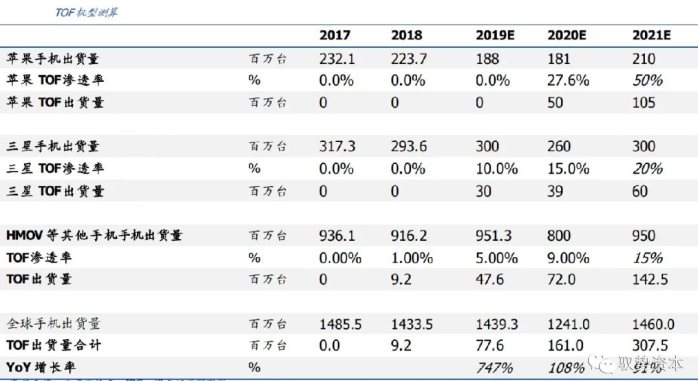 我们预测2019/2020年TOF的出货量为7760万/1.6亿部,同比大幅增长747%/108%。