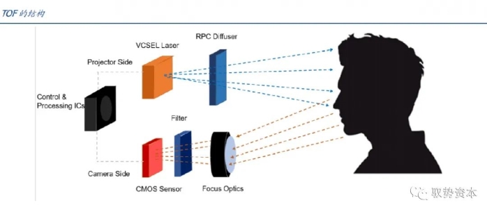 TOF和结构光二者虽然原理不同,但其所需要的核心部件基本相同,TOF中的核心部件包括发射端的VCSEL光源、Diffuser等,接收端的镜头、窄带滤光片、近红外CMOS等。