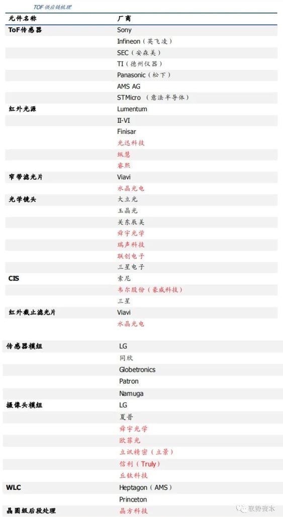 目前TOF或结构光的3D感知技术均为主动感知,因此3D摄像头产业链与传统摄像头产业链相比主要新增加红外光源、红外传感器和光学组件等部分。通过对已经上市的主流3D摄像头产品进行拆解分析,3D摄像头产业链可以被分为:
