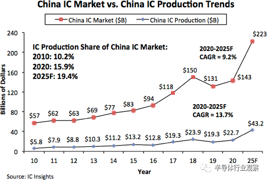 如图1所示,2020年中国的IC产量占其1,434亿美元IC市场的15.9%,高于2010年10年前的10.2%。此外,IC Insights预测,到2025年,这一份额将比2020年增加3.5个百分点,达到19.4%。(平均每年增长0.7个百分点)。