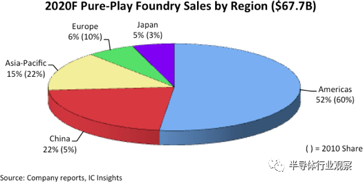 预计日本仍将是纯晶圆代工销售的最小市场,今年的市场份额仅为5%(比2010年的份额仅增长2个百分点)。预计到2020年日本的晶圆代工市场价值约为36亿美元,日本的纯晶圆代工销售份额预计将约为2020年美洲纯晶圆代工市场(351亿美元)的10%。