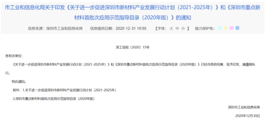 2020年12月30日,深圳市工业和信息化局发布《关于进一步促进深圳市新材料产业发展行动计划(2021-2025年)》(下称《行动计划》),加快发展具有深圳特色的新材料产业生态体系。