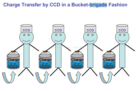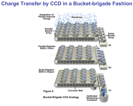 CCD传感器基本工作原理,光照射每个像素产生电荷并累积。由于CCD只有一个读出端口,因此需要串行的将每个像素的电荷在像素之间进行转移到输出端口。最终将电荷转换为电压,进行放大和AD转换得到图像。