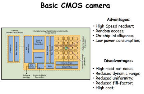 CMOS和CCD传感的一个很大的区别是,每个CMOS传感器像素都有自己的读出电路,它位于光敏区旁。CMOS图像传感器足够便宜,可以用于智能手机,而且比CCD传感器消耗更少的电能。它们还允许像素级的图像处理,用于感兴趣的区域、分类、过滤等。但是CMOS传感器往往表现出较低的动态范围,更多的读取噪声和更不均匀的空间响应。由于这些原因,测量传感器的特性必不可少。