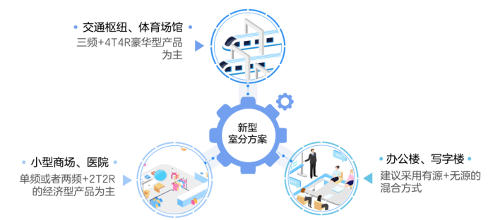 对于小型楼宇专门部署基站显然是投入产出不高,但是在一些大型场景如交通枢纽、体育场馆、摩天大楼等,投入和产出的天平发生了倾斜。我们可以拾回前面的思路,考虑为这些大型场景专门部署室内基站,这就是有源数字室分方案。
