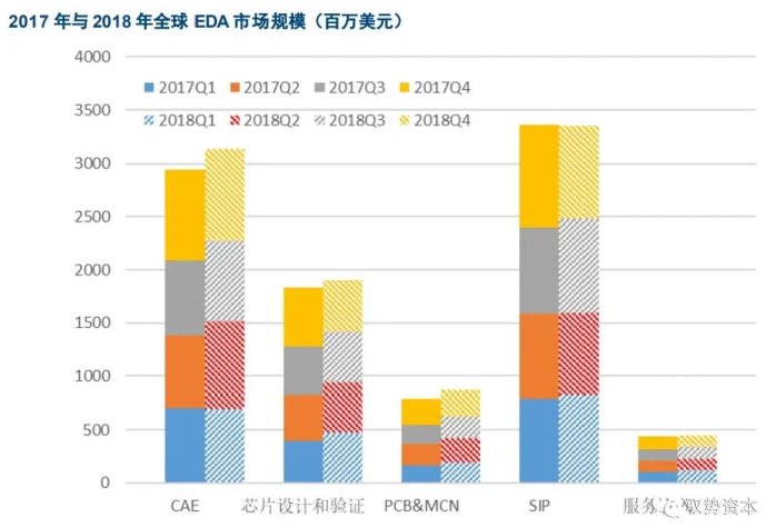 在2017年,IP核的交易已经超越了EDA工具和服务本身,成为EDA产业交易规模最大的一部分。但与2017年IP核强劲增长相比,2018年IP核带来的收入显著下降,同比减少11.8%,这一下降部分源于第四季度IP供应商的会计和报告变化,并导致2018年第四季度EDA产业收入同比下降3.1%至2.57亿美元。全年来看,EDA产业收入略有增长,同比增长3.83%。