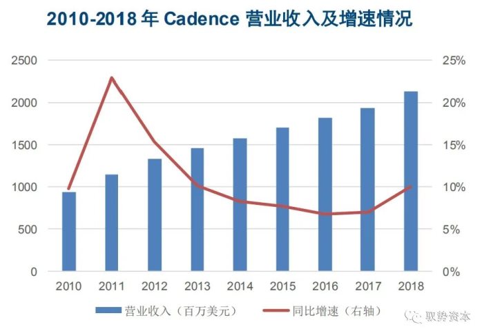 Cadence(铿腾电子)是EDA行业销售排名第二的公司,在1988年由SDA与ECAD两家公司兼并而成,Cadence通过不断扩展、兼并、收购,到1992年已占据EDA行业龙头地位,但到2008年被Synopsys超越。