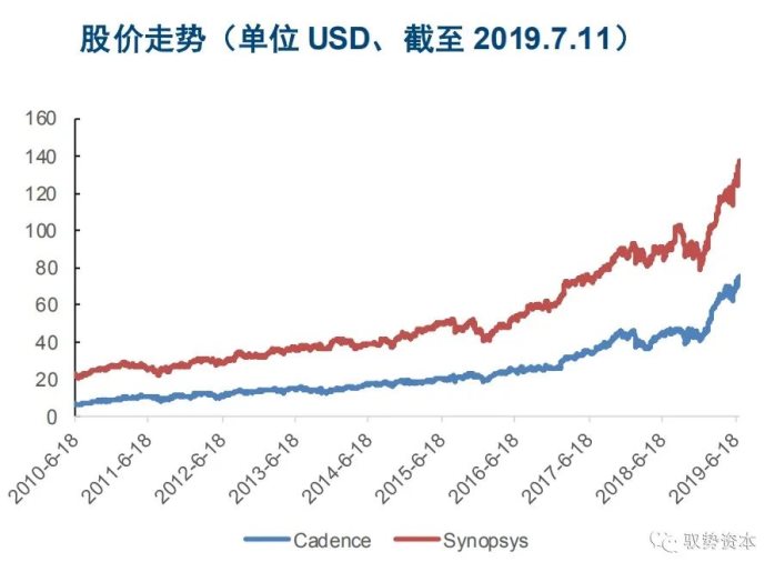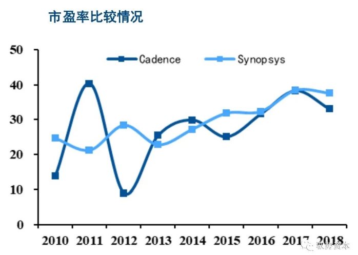 从股市表现来看,Synopsys和Cadence股价均稳步上升,当前Synopsys市值有204.5美元,市盈率47倍;Cadence市值有211.3亿美元,市盈率61倍。