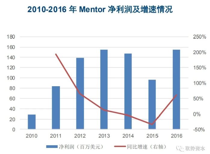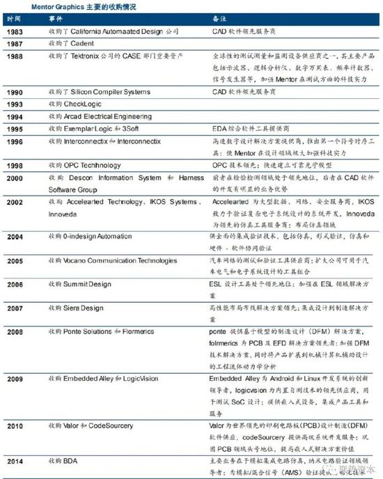 Mentor Graphics自成立开始,就关注各细分市场的的佼佼者,一步步收购了多家在某些细分领域技术上数一数二的中小型EDA公司,从而实现了企业稳步发展成长的目的。