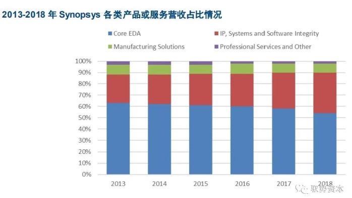 Synopsys提供的产品与服务主要分为四类:EDA、IP、制造解决方案、专业服务与其他,其中EDA产品占Synopsys总收入中的一半以上。