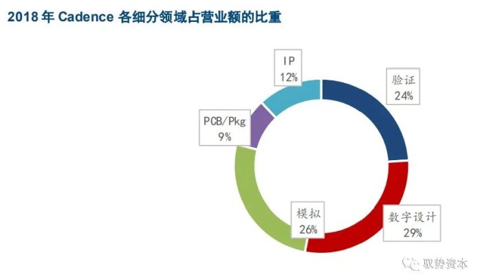 Cadence将主营业务分为五类,分别是验证、数字设计、模拟、PCB、IP,其中前三项的地位更为重要,占主营业务收入的份额在75%左右。