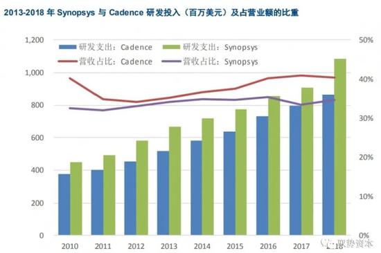 除大量收购有潜力的公司以外,Synopsys和Cadence还一直重视新技术的开发,每年投入大比例资金用于研发,研发费用是公司最大的营运开支。尤其是Cadence公司,近两年研发支出占总营收的比例超过40%。