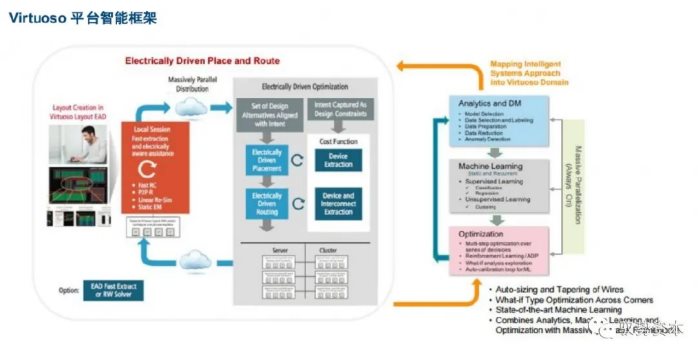 芯片敏捷设计是未来发展的一个主要方向,深度学习等算法能够提高EDA软件的自主程度,提高IC设计效率,缩短芯片研发周期。据Cadence的报告显示,机器学习在EDA的应用可以分为四个方面:数据快速提取模型;布局中的热点检测;布局和线路;电路仿真模型。Cadence致力于研究将机器学习应用在Virtuoso平台上,并参与了ERI中智能设计芯片项目。新思科技也在利用人工智能加速时序验证。