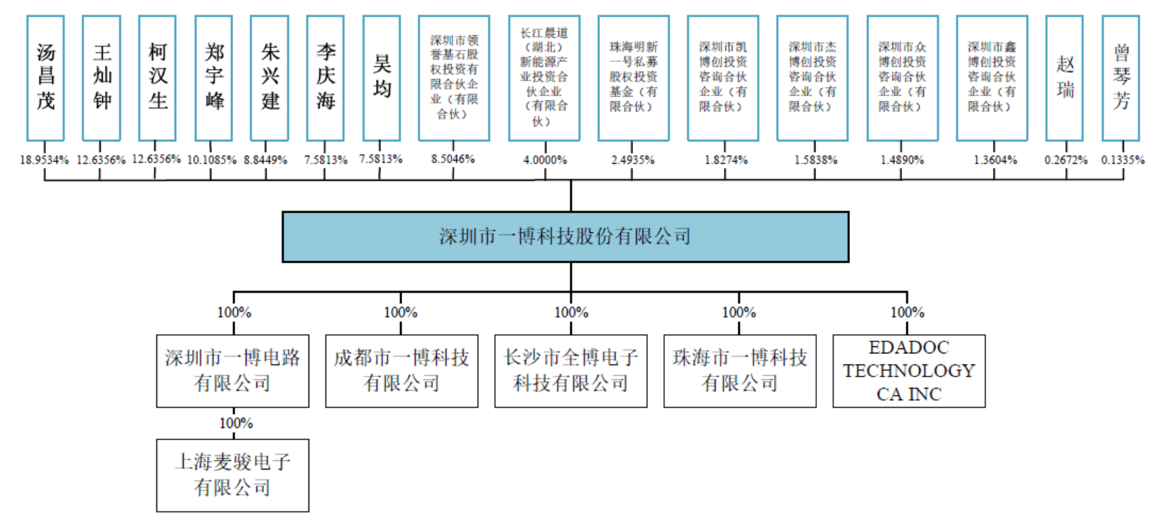 截至招股说明书签署之日,汤昌茂、王灿钟、柯汉生、郑宇峰、朱兴建、李庆海、吴均为公司控股股东和实际控制人,七人合计持有公司 4,896.2880 万股,占总股本 78.34%。一博科技股权结构如下: