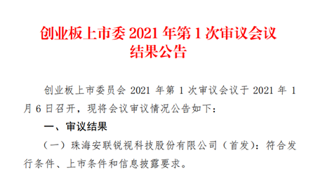 1月6日,创业板上市委员会2021年第1次审议会议结果显示,安联锐视首发符合发行条件、上市条件和信息披露要求。