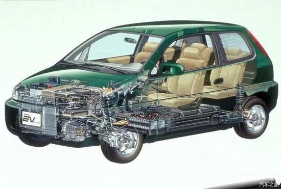 我们先来说说通用,通用跟镍氢电池还是有段故事可以讲讲的。一开始Stanford R. Ovshinsky弄出了一种可供量产的镍氢电池并申请了专利,1982年成立了Ovonic电池公司,通用汽车1994年购买了Ovonics专利,随后用在了EV1后期版本上,就是下图这个。