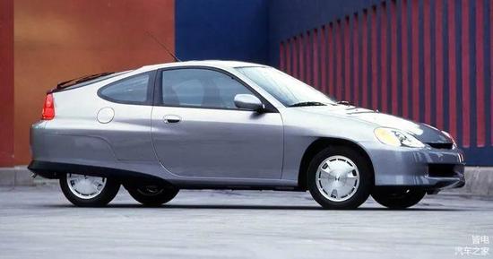 本田Insight(混动):初代1999-2006(下图),二代2009-2014,三代2019至今。Insight是本田第一代IMA混动系统的试验田,薄片电机放在P1位置,飞轮之后、变速箱之前,镍氢电池使用D型。