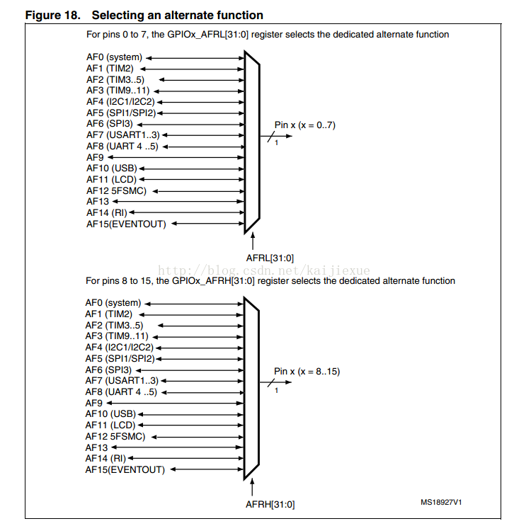 每个IO端口可以通过配置GPIOx_AFRL和GPIOx_AFRH设置所使能的复用功能(AF0~AF15)