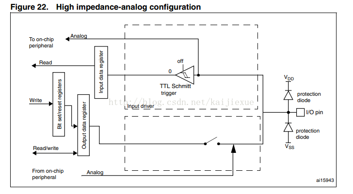 输入模式下的施密特触发器被激活(为每个IO口的模拟值提供零功耗,施密特触发器的输出端被强制输出为0)
