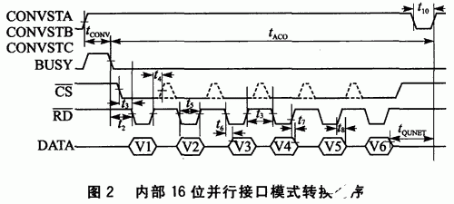 AD7656是6通道16位逐次逼近型ADC,有2种接口模式:串行接口模式和高速的并行接口模式,并行接口模式又分为8位和16位传送方式。在数据转换时,3个转换信号 CONVSTA/B/C,用来控制每对或每4个或每6个ADC同时采样。如果将3个CONVST引脚连接在一起,就可对6个ADC同时进行采样。在 CONVSTX的上升沿,被选择的ADC对被置为保持模式,转换开始。CONVSTX的上升沿过后,BUSY信号变为高电平表明转换正在进行,转换时间是 3μs,BUSY信号返回低电平表明转换结束。在BUSY信号的下降沿,ADC回到跟踪模式,数据可以通过并行或串行接口从输出寄存器读出。16位并行接口读取数据时先将CS置低,每当读信号(RD)变低,就从16位总线上读取1路数据,6路A/D数据则需要读取6次,其内部转换16位并行接口模式时序如图2所示。
