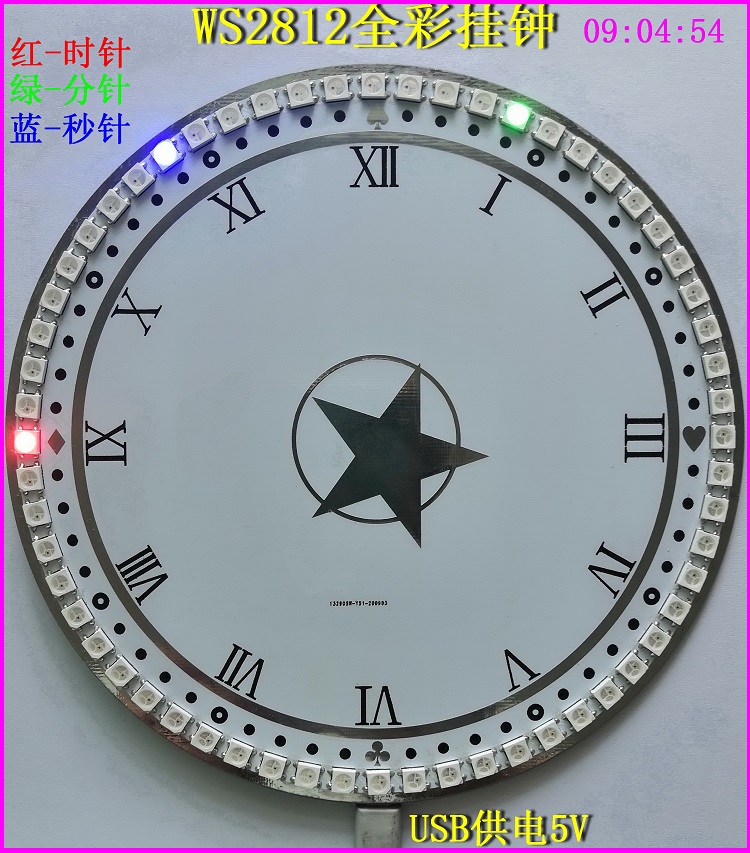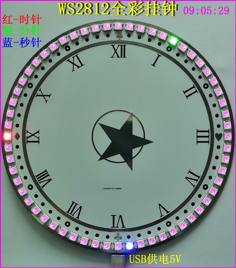 A、红色常亮表示时针,绿色慢呼吸灯表示分针、蓝色每秒走一灯。