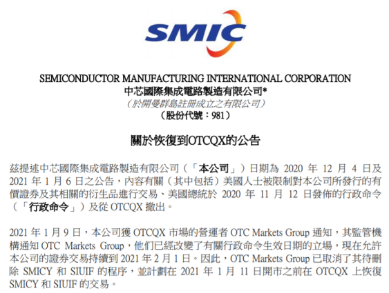 1月10日,中芯国际发布公告称,2021 年 1 月 9 日,本公司获 OTCQX 市场的营运者 OTC Markets Group 通知,其监管机构通知 OTC Markets Group,他们已经改变了有关行政命令生效日期的立场,现在允许本公司的证券交易持续到 2021 年 2 月 1 日。因此,OTC Markets Group 已取消了其待删除 SMICY 和 SIUIF 的程序,并计划在 2021 年 1 月 11 日开市之前在 OTCQX 上恢复SMICY 和 SIUIF 的交易。