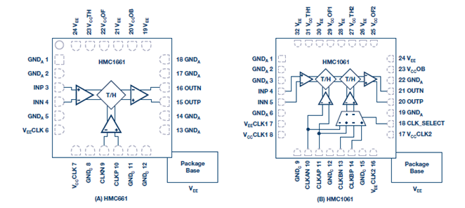 以单级THA HMC661为例,产生的输出由两段组成。在输出波形(正差分时钟电压)的采样模式间隔中,器件成为一个单位增益放大器,在输入带宽和输出放大器带宽的约束下,它将输入信号复制到输出级。在正时钟到负时钟跃迁时,器件以非常窄的采样时间孔径对输入信号采样,并且在负时钟间隔内,将输出保持在一个相对恒定的代表采样时刻信号的值。配合ADC进行前端采样时,常常优先使用单级器件(ADI 同时法布里了两级THA 的型号HMC1061),原因是多数高速ADC已经在内部集成一个THA,其带宽通常要小得多。因此,在ADC之前增加一个THA便构成一个复合双级组件(或一个三级组件,如果使用的是双级HMC1061),THA在转换器前面。采用同等技术和设计时,单级器件的线性度和噪声性能通常优于双级器件,原因是单级器件的级数更少。所以,单级器件常常是配合高速ADC进行前端采样的最佳选择。