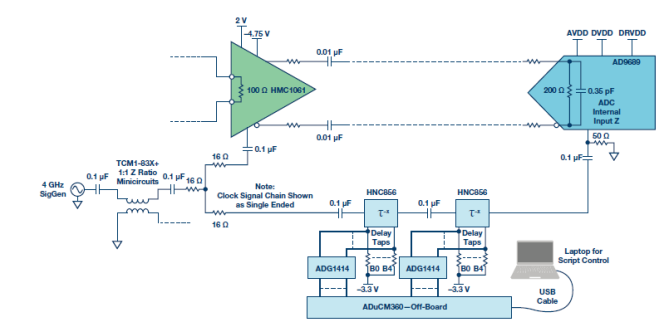 在电路板上完成该过程可能冗长乏味,因为纸面分析可能不会考虑PCB板上时钟走线传播间隔造成的相应延迟,内部器件组延迟,ADC孔径延迟,以及将时钟分为两个不同段所涉及到的相关电路(一条时钟走线用于THA,另一条时钟走线用于ADC)。设置THA和ADC之间延迟的一种方法是使用可变延迟线。这些器件可以是有源或无源的,目的是正确对准THA采样过程的时间并将其交给ADC进行采样。这保证了ADC对THA输出波形的稳定保持模式部分进行采样,从而准确表示输入信号。