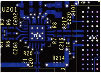信号通过差分模式连接到THA输入(我们同时是也提供单端射频信号输入的参考设计链路),形成单一前端网络。为了最大限度地减少过孔数量和总长度,我们在这里特别小心,让过孔不经过这两条模拟输入路径,并且帮助抵消走线连接中的任何线脚。
