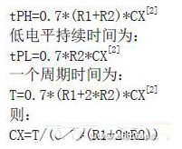 测量电阻时,另用一个555组成一个多谐振荡器电路,将待测电阻RX接在R1的位置(或者将RX和一个已知电阻串联),CX替换成一个已知的电容C.这样一个周期时间为: