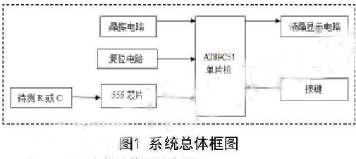整个测量系统由单片机最小系统,按键,电阻、电容和555组成的多谐振荡器和液晶显示等几个电路模块组成。如图1所示。