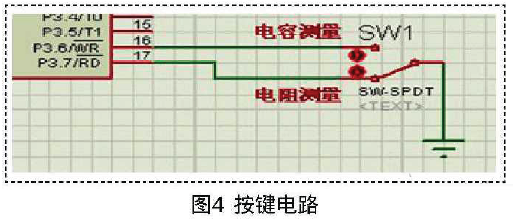 按键电路用于确定是测量电容还是电阻,如图4所示,采用了一个单刀双掷按键。当按键打到上方接通单片机P3.6引脚时,用于测量电容;打到下方P3.7引脚时,用于测量电阻。