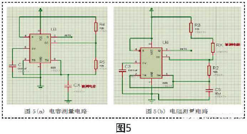 如图5所示,利用555和待测电容或者电阻组成多谐振荡器,555产生的周期性方波从Q引脚输出,然后接至单片机的外部中断INT0引脚,即P3.2引脚。测量时,两电路只有一个接至单片机,分别用于测量电容和电阻。